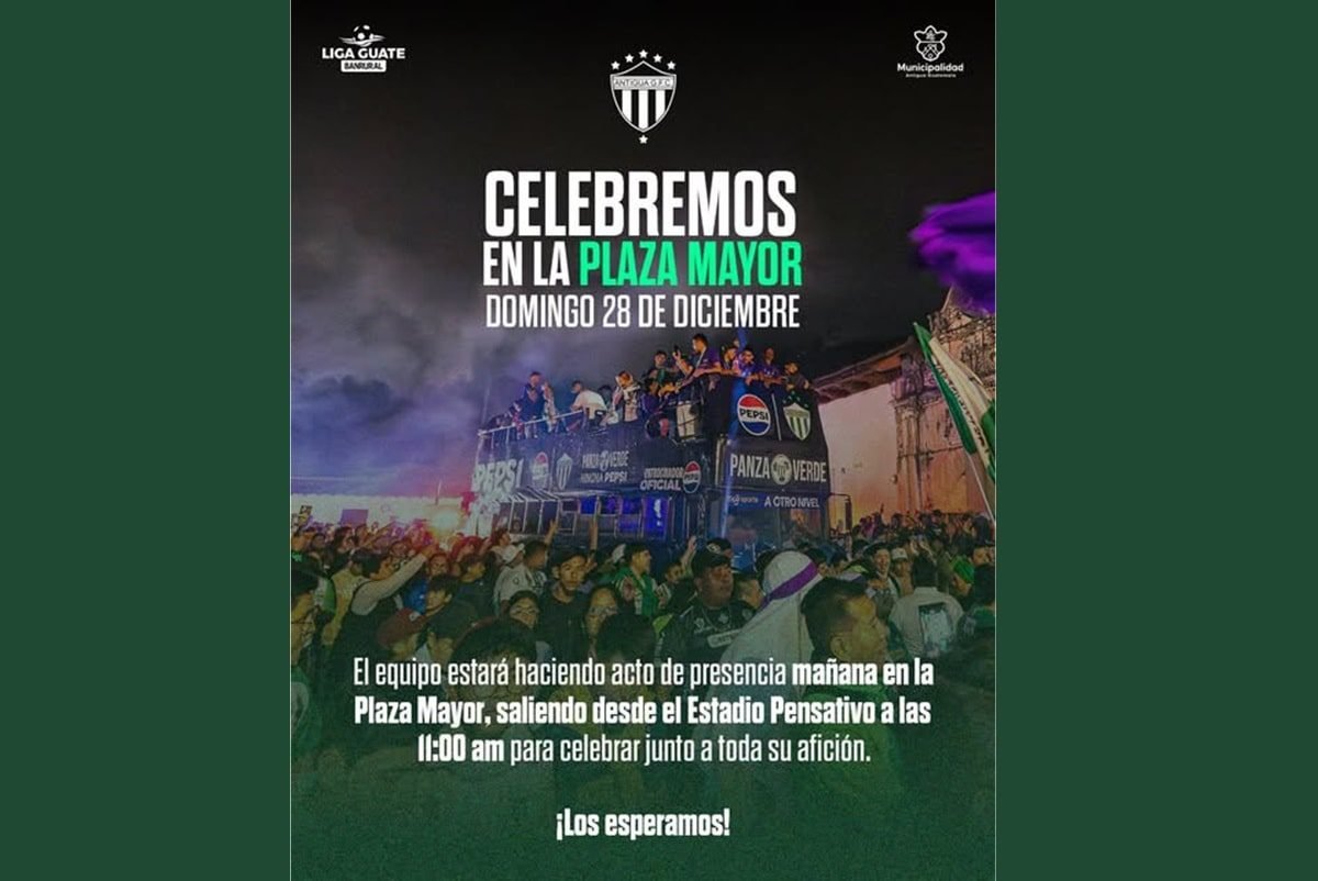 El Antigua GFC celebrará su bicampeonato del fútbol guatemalteco este domingo 28 de diciembre, con un recorrido festivo que iniciará a las 11:00 horas desde el Estadio Pensativo y culminará en la Plaza Mayor de Antigua Guatemala, según información oficial del club.