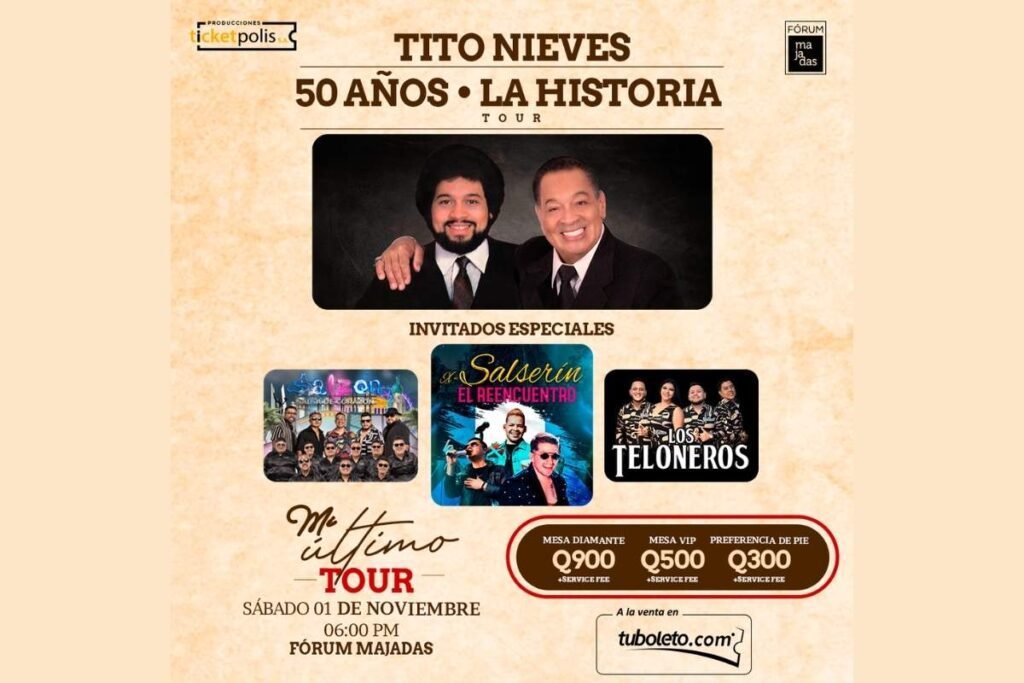 La salsa vuelve a sonar fuerte en la Ciudad de Guatemala. El legendario Tito Nieves, conocido como El Pavarotti de la Salsa, llega al país con su gira internacional “50 Años: La Historia Tour”. Será un espectáculo que promete hacer vibrar corazones y encender la pista de baile. La noche será aún más especial con el reencuentro de Salserín, la orquesta juvenil que marcó a Latinoamérica en los años 90. Regresa para desatar nostalgia y energía.