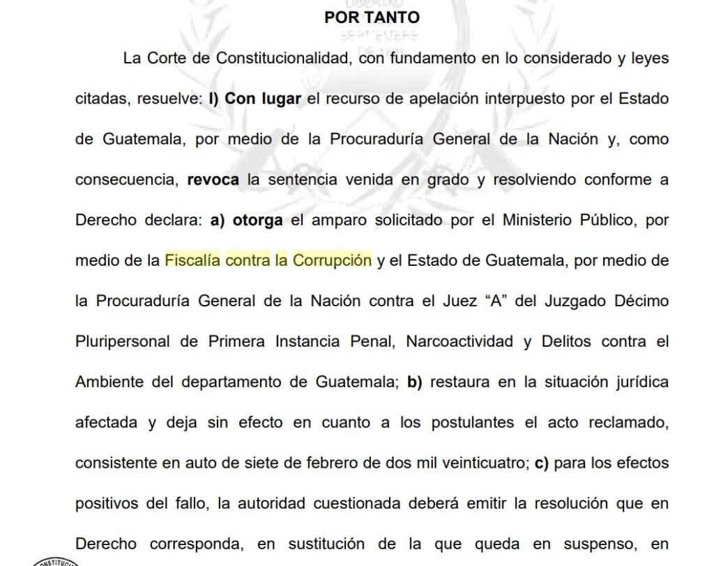 La decisión de la CC responde a un amparo presentado por la Fiscalía contra la Corrupción y la Procuraduría General de la Nación (PGN) contra el Juez “A” del Juzgado Décimo Pluripersonal de Primera Instancia Penal, Narcoactividad y Delitos contra el Ambiente de Guatemala, que había favorecido a los exfuncionarios.