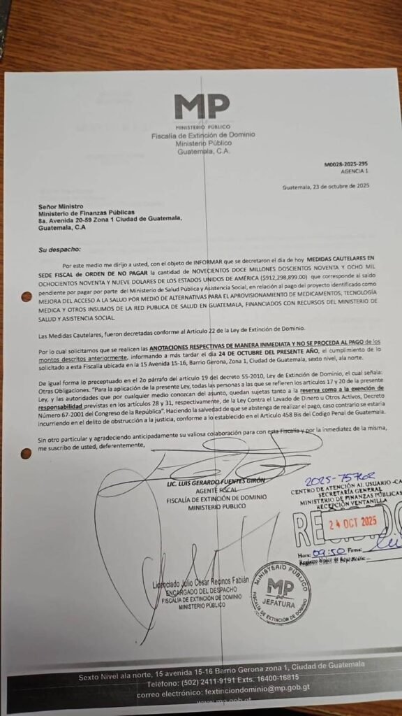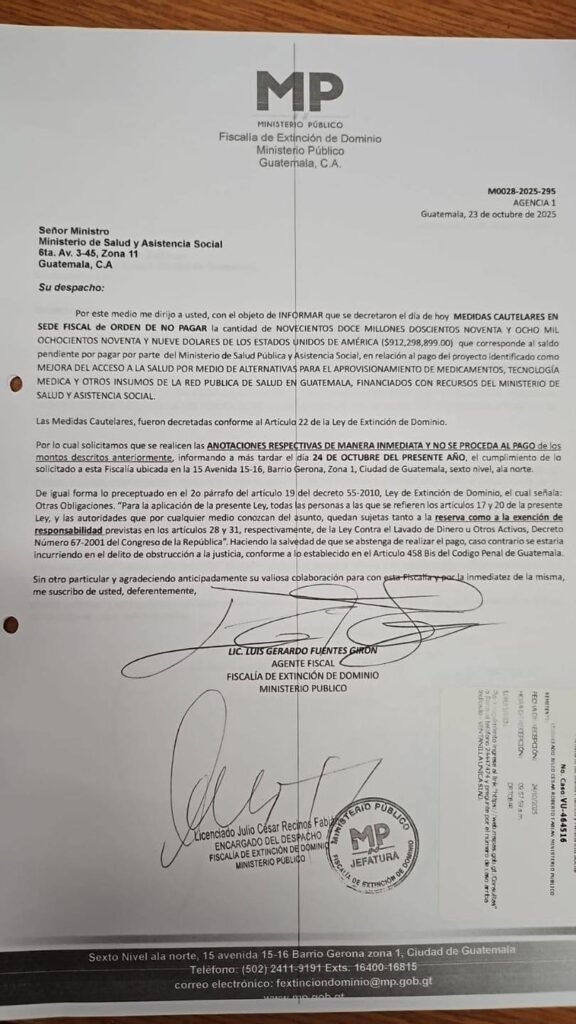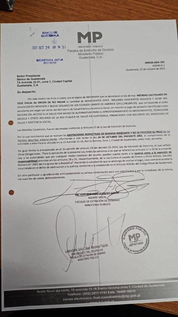 El MP detalló que la medida fue notificada al Ministerio de Salud, al Ministerio de Finanzas Públicas y al Banco de Guatemala para su cumplimiento inmediato.