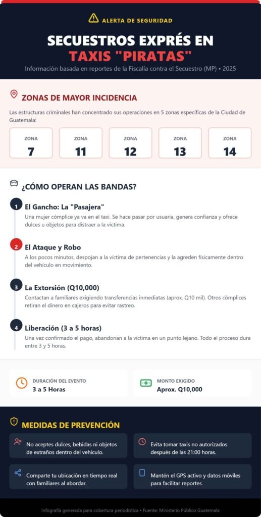 El Ministerio Público (MP) encendió nuevamente las alarmas por el repunte de secuestros exprés en la Ciudad de Guatemala, una modalidad delincuencial que volvió a intensificarse en la antesala de las fiestas de fin de año.