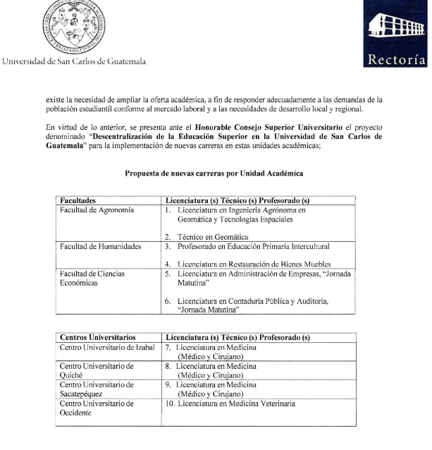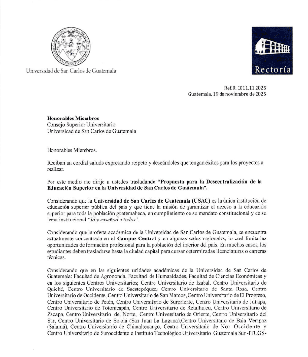 La iniciativa fue presentada por el rector Walter Mazariegos ante el Consejo Superior Universitario (CSU), según un oficio que detalla la intención de ampliar y descentralizar la educación superior.