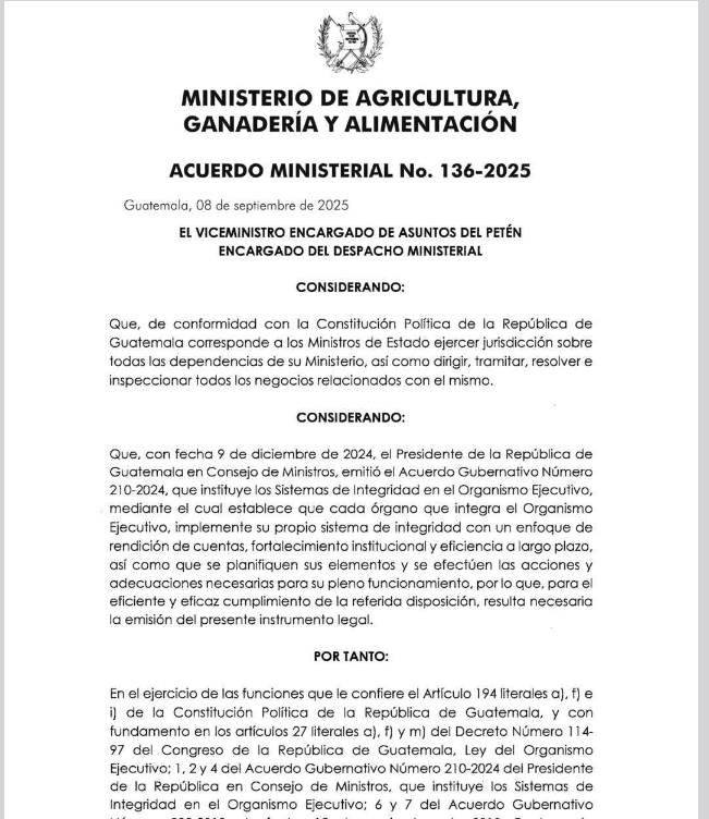 Por su parte, el Ministerio de Agricultura, Ganadería y Alimentación (MAGA) lanzó, mediante el Acuerdo Ministerial 136-2025, su propio Sistema de Integridad, publicado en el Diario de Centro América (DCA).