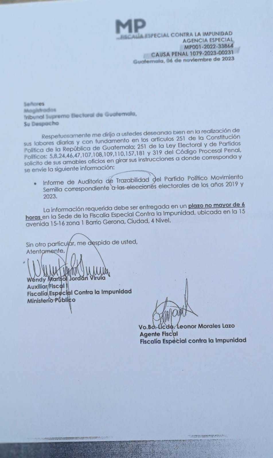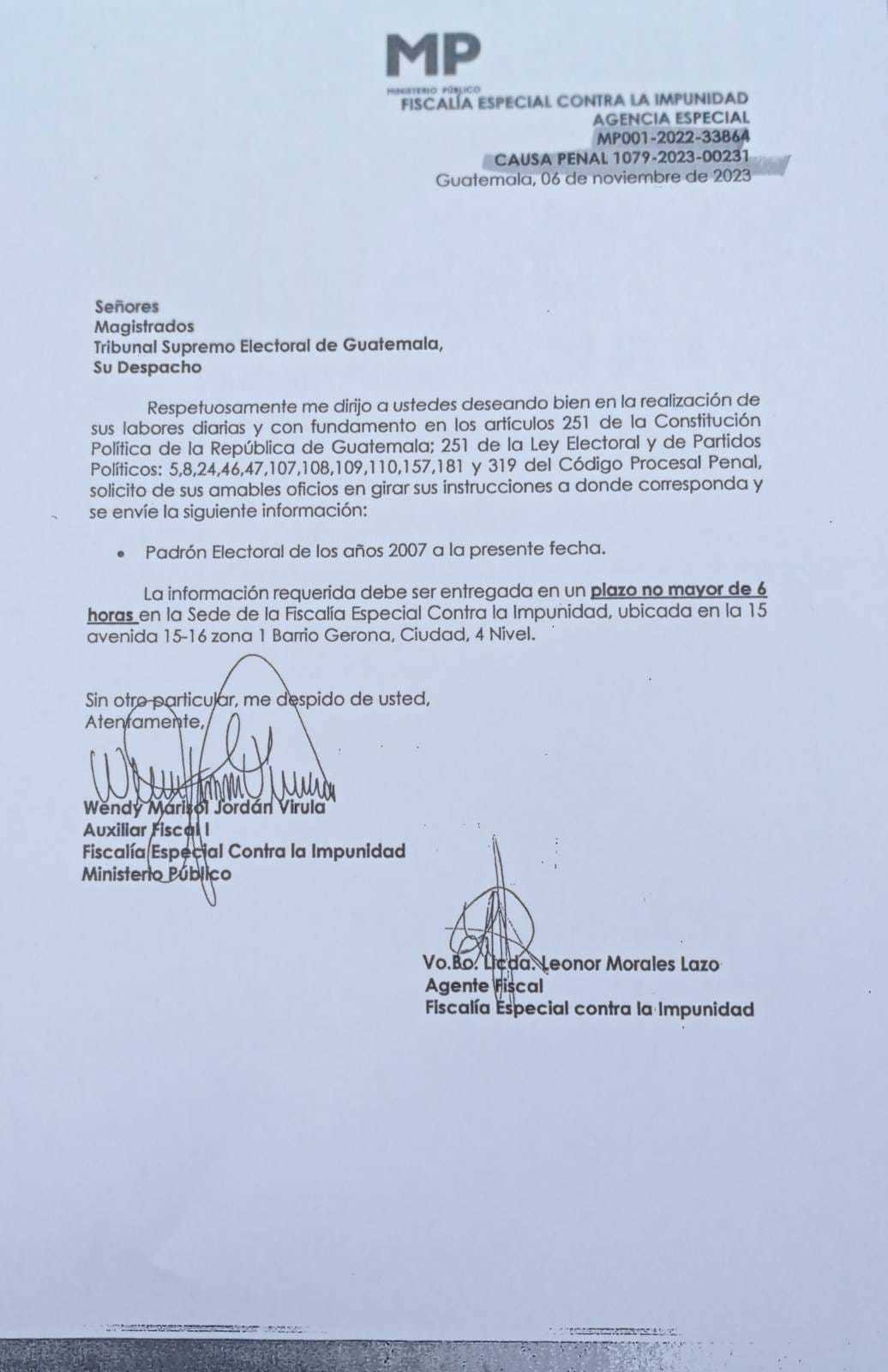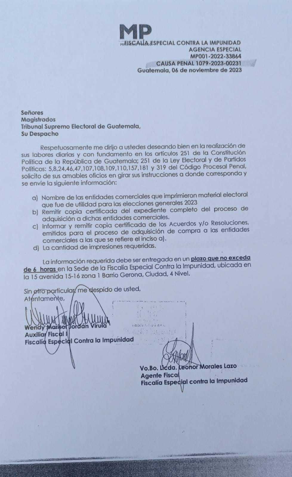 La FECI establece un plazo máximo de 6 horas para que el TSE entregue esta información en su sede, ubicada en la 15 avenida 15-16, zona 1, Barrio Gerona, Ciudad, 4° Nivel.