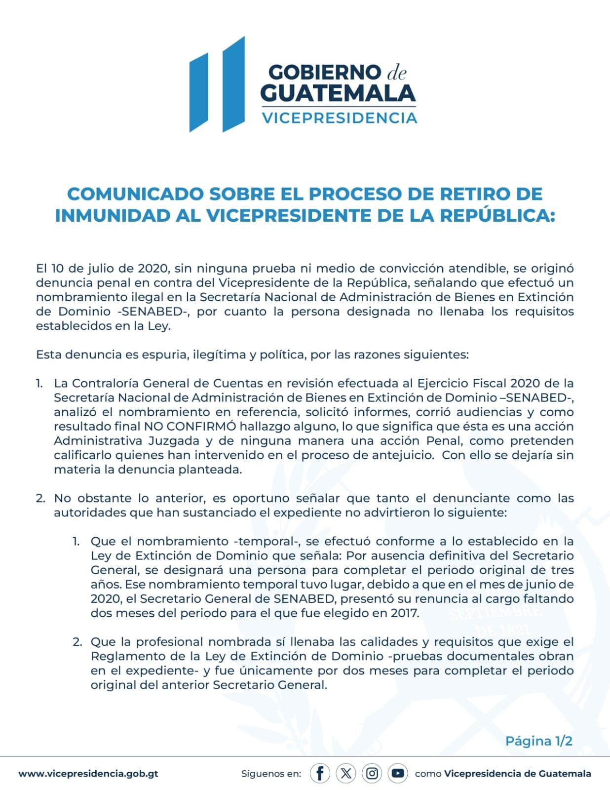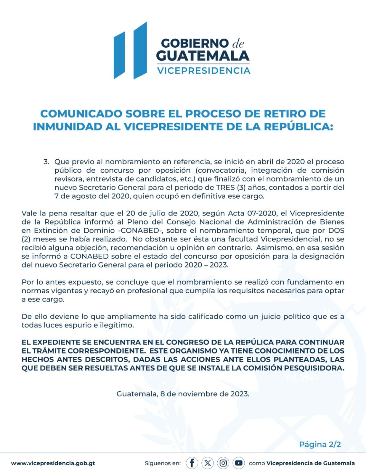 “La Contraloría General de Cuentas en revisión efectuada al Ejercicio Fiscal 2020 de la Senabed analizó el nombramiento en referencia, solicitó informes, corrió audiencias y como resultado final NO CONFIRMÓ hallazgo alguno, lo que significa que esta es una acción Administrativa Juzgada y de ninguna manera una acción Penal, como pretenden calificarlo quienes han intervenido en el proceso de antejuicio. Con ello se dejaría sin materia la denuncia planteada”, explica el documento.